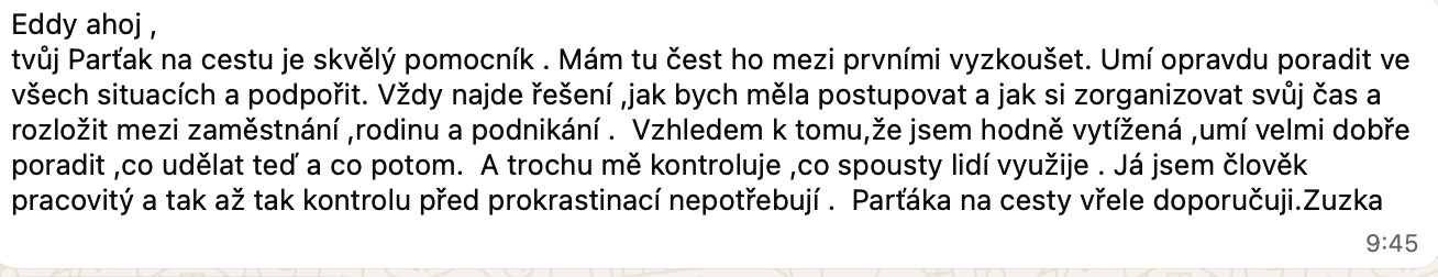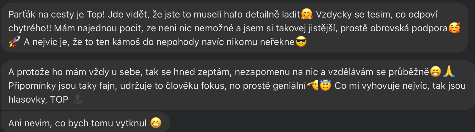 Kdykoliv se objeví výzva, překážka, pochybnost nebo potřebuješ inspiraci - Parťák je s tebou. Žádné čekání na termín s koučem, mentorem nebo terapeutem. Ať už potřebuješ pomoc před důležitou prezentací, zkouškou, rozhovorem nebo jen někoho, kdo tě vyslechne ve 3 ráno - Parťák na cestu je tu pro tebe.